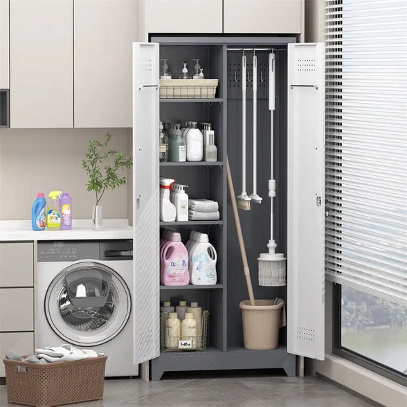 【Improved Functionality】-Our broom closet storage cabinet is designed with Separate panels and hanging hooks to prevent moisture and water accumulation. This feature allows you to safely store wet cleaning tools, making it the ideal choice for your cleaning tool storage needs.
