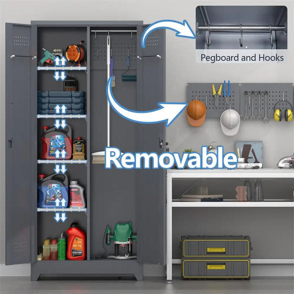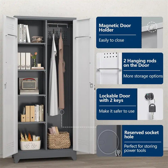 【Spacious Storage】-Our Metal Storage Cabinet with Locking Doors provides ample room for a variety of items with 4 shelves and hanging rod. With more vertical space than other products, you can store sundries, mops, fishing rods, snowboards, and other miscellaneous items conveniently.